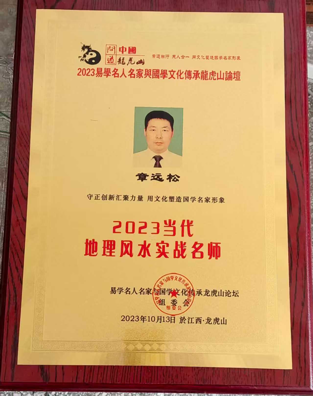 2023年10月在江西参加2023易学名人名家与国学文化传承龙虎山论坛会议上获得“易学文化传承人”“国学文化传承名家”“2023当代地理风水实战名家”荣誉称号。