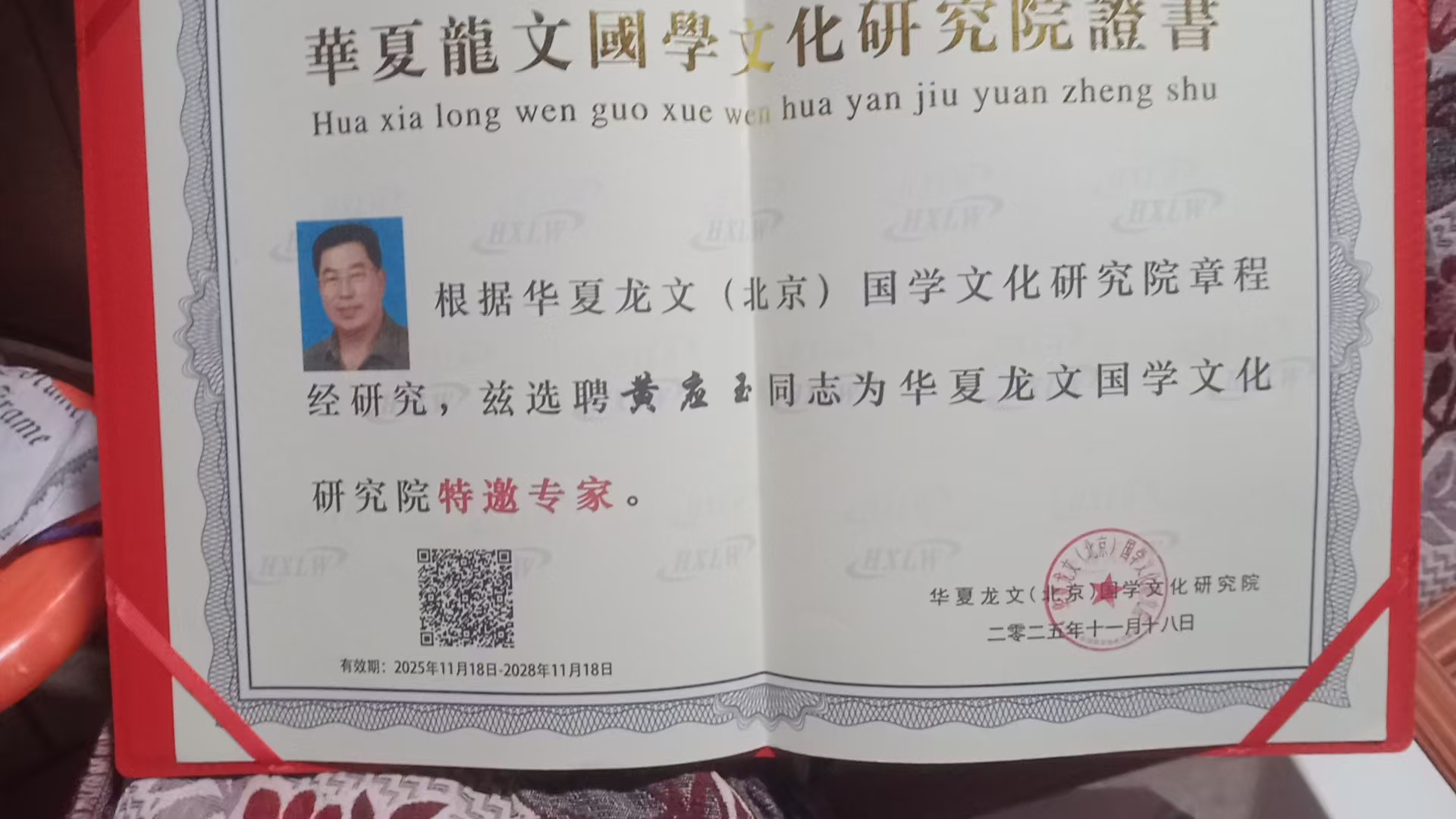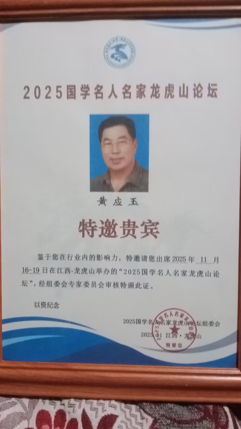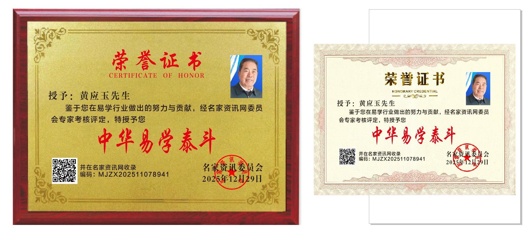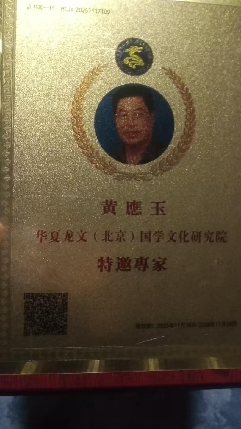 这份专业影响力也持续获得权威平台的肯定:2025年11月,黄应玉被华夏龙文(北京)国学文化研究院选聘为“特邀专家”(聘期至2028年11月),同期受邀担任“2025国学名人名家龙虎山论坛”特邀贵宾,以行业代表身份参与传统文化交流盛会;2025年12月,经名家资讯网委员会专家考核评定,他被授予“中华易学泰斗”荣誉称号,并录入名家资讯网专业人才库,其在易学领域的深耕与贡献得到了行业平台的高度认证。
