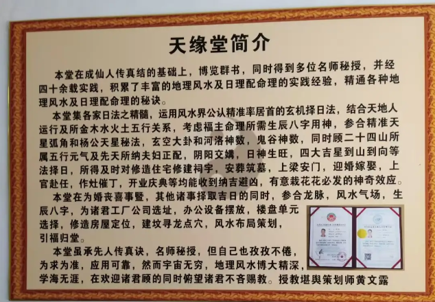 自幼浸润于天缘堂的文化熏陶,黄文露对易学产生了浓厚的探索热忱。天缘堂日馆作为深耕易学领域的专业机构,积淀了历代传承的易学秘要与实践经验,为她搭建了坚实的研学平台。她师从先辈潜心钻研,遍读《易经》《葬经》《青囊经》等经典典籍,从阴阳五行、天星理气的古老智慧中汲取养分,又承蒙多位名师秘授,历经数十载实践磨砺,将玄空大卦、河洛神数、杨公天星秘法等多元理论融会贯通。为精进技艺,她始终保持谦逊求知之心,以天缘堂日馆为纽带,积极与业界同行交流切磋,在海量实践案例中提炼经验,形成了兼具系统性与实用性的易学应用体系。凭借扎实的专业功底,她不仅让天缘堂日馆的品牌影响力持续提升,更个人获颁“高级易道堪舆策划师”“中国易经协会高级风水策划师”等资质认证,以专业实力立足业界。