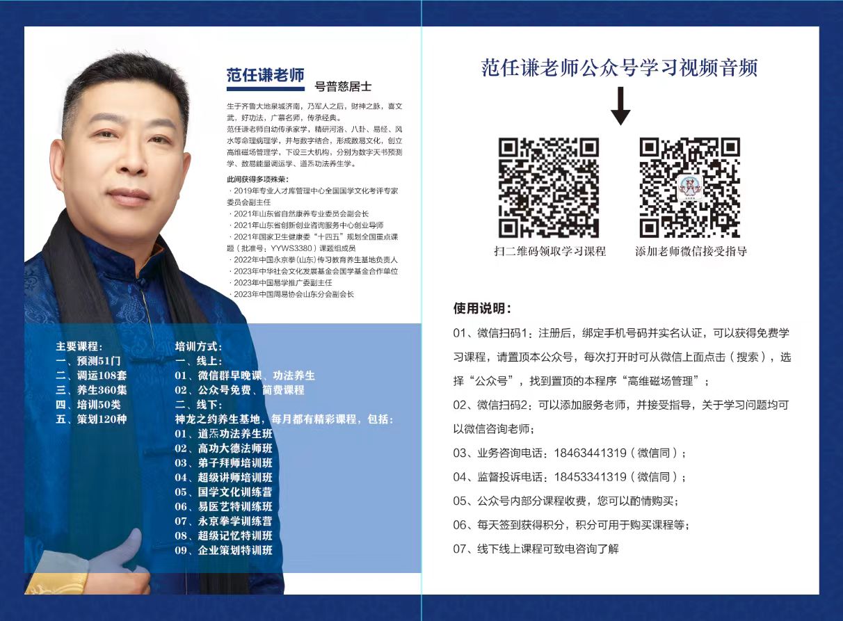 范任谦老师自幼传承家学,精研河洛、八卦、易经、风水等命理病理学,并与数字结合,形成数易文化,创立高维磁场管理学,下设三大机构,分别为数字天书预测学、数易能量调运学、道炁功法养生学,在预测、调整、养生、培训、策划、拳法等六大领域卓有成就!