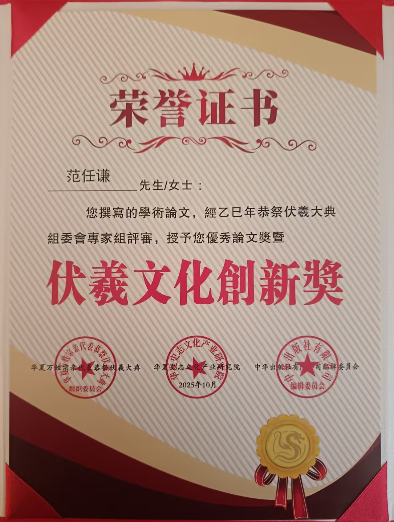 2025年华夏万姓宗亲代表恭祭太昊伏羲大典荣誉主席,获得乙巳年恭祭伏羲大典优秀论文奖暨伏羲文化创新奖