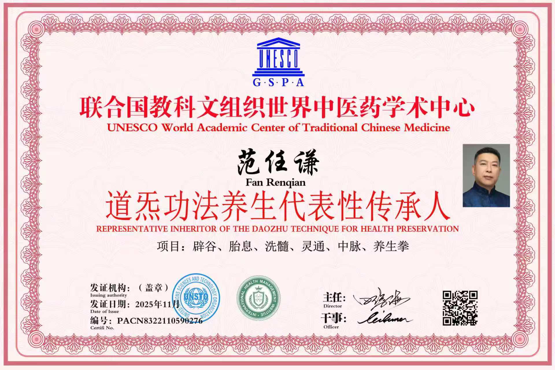 2025年联合国教科文组织世界中医药学术中心道炁功法养生代表性传承人