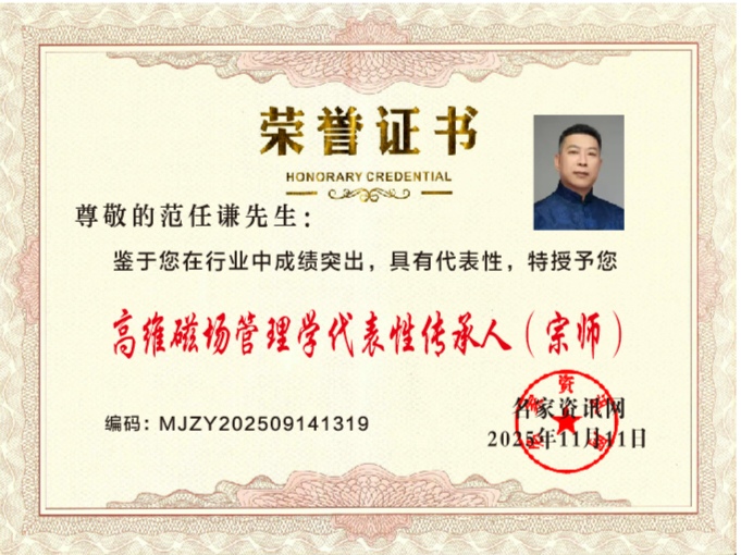 2025年获得名家咨询高维磁场管理学代表性传承人(宗师)荣誉证书