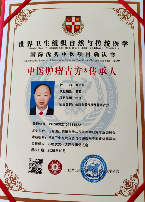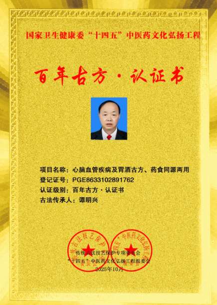 在数十年的临床实践中,谭明兴深耕心脑血管疾病、消化系统疾病及筋骨类病症领域,形成了独具特色的诊疗体系。针对胃炎、结肠炎等高发慢性胃肠病,他带领团队深入云贵川腹地采集民间验方,梳理《伤寒论》《脾胃论》等典籍精髓,历经6年临床跟踪213例患者,创新提出“胃肠同治,气血双调”理论,研发的中药体系以砂仁为君、枳实枳壳为臣,配伍十二味佐使药构建四维修复网络,使胃黏膜修复速度提升3倍,结肠溃疡愈合率大幅提高,相关成果荣获国家发明专利。在治疗心脑血管疾病方面,他巧用柴胡、黄芪、郁金、水蛭等自然药物组方,能有效清除血管斑块,对脑梗、冠心病等病症的有效率高达98%,为无数患者筑起健康屏障。此外,他在脑梗后遗症、腰椎间盘突出、乳腺增生等病症的治疗中不断突破,将药物治疗与针灸、推拿、康复训练相结合,形成多元化治疗模式,尽显中医“因人而异”的辨证施治优势。