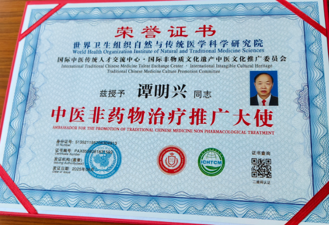 医术精湛的同时,谭明兴的学术成就与社会影响力也广受认可。他先后荣获“中医医师终身成就奖”“全国中医药科技创新特别贡献奖”“中医治未病科技创新影响力人物”等多项荣誉,身兼中国康复医学会会员、泰中健康产业发展促进会客座教授、聚医杰健康产业服务平台客座教授等多重职务。作为“国际中医宣传大使”“新时代非遗文化传播大使”,他频繁活跃于国内外学术交流舞台,不遗余力地向世界推介中医药文化,让东方智慧惠及更多人群。